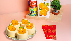 Top the pudding with the orange jelly balls, a sprig of mint leaf, and a slice of mandarin then serve