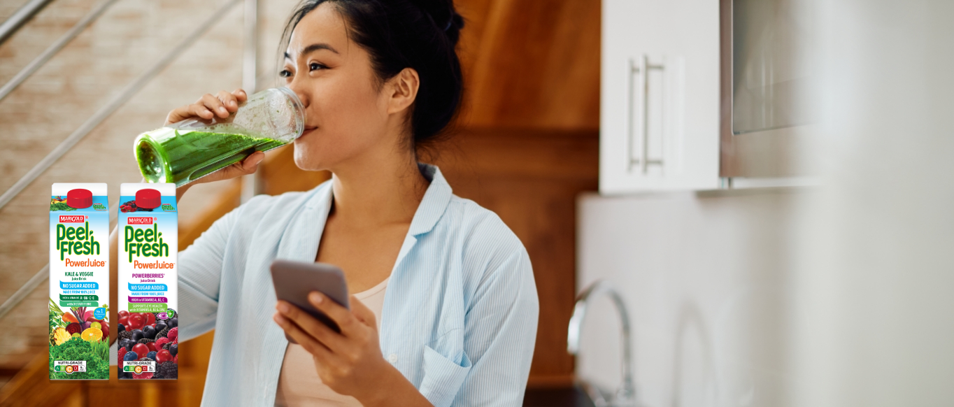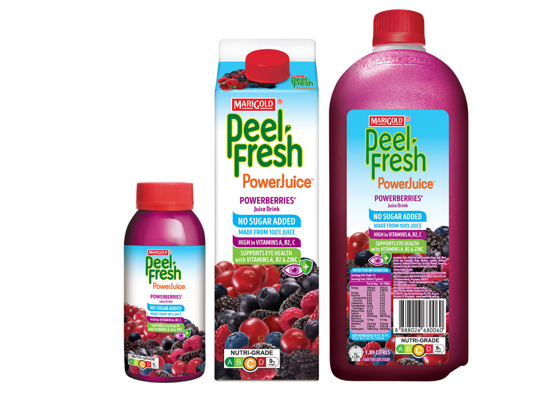 Those wishing to reduce their sugar intake may consider MARIGOLD PEEL FRESH Less Sugar – the Less Sugar juices are not only lower in sugar, but also high in Vitamins A, C, E and contain dietary fibre that aids digestion. Though the juices are lower in sugar, you get the great fresh taste without artificial sweeteners!